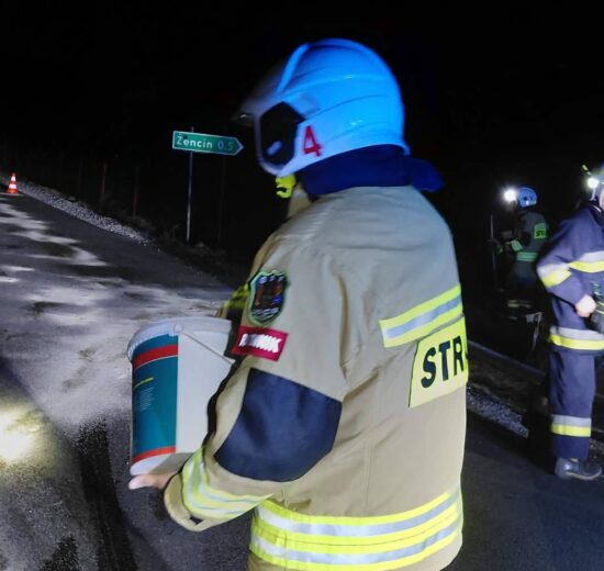 Nocna akcja strażaków z OSP Lipowczyce w gminie Kodrąb. Usuwali z jezdni w Żencinie substancję ropopochodną