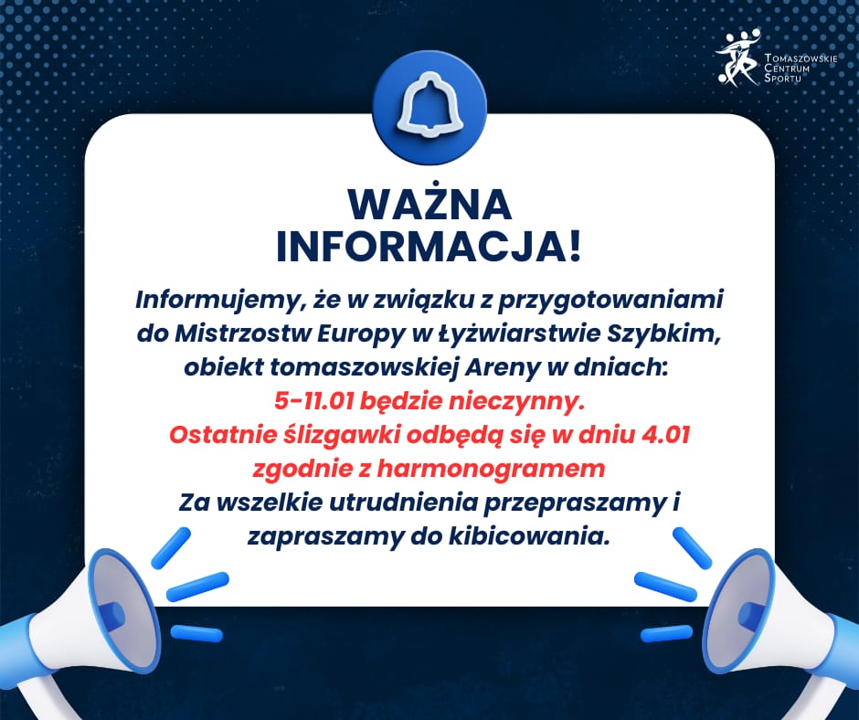Tomaszowskie Centrum Sportu informuje, iż w związku z przygotowaniami do Mistrzostw Europy w Łyżwiarstwie Szybkim Arena Lodowa w Tomaszowie Mazowieckim będzie czasowo zamknięta dla użytkowników. Obiekt będzie nieczynny w dniach 5–11 stycznia.