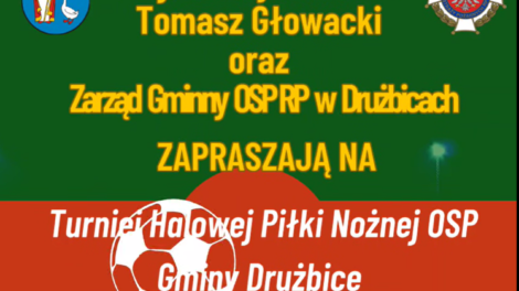 Wójt Gminy Drużbice Tomasz Głowacki oraz Gminny Zarząd Ochotniczych Straży Pożarnych w Drużbicach zapraszają na Gminny Turniej Halowej Piłki Nożnej...