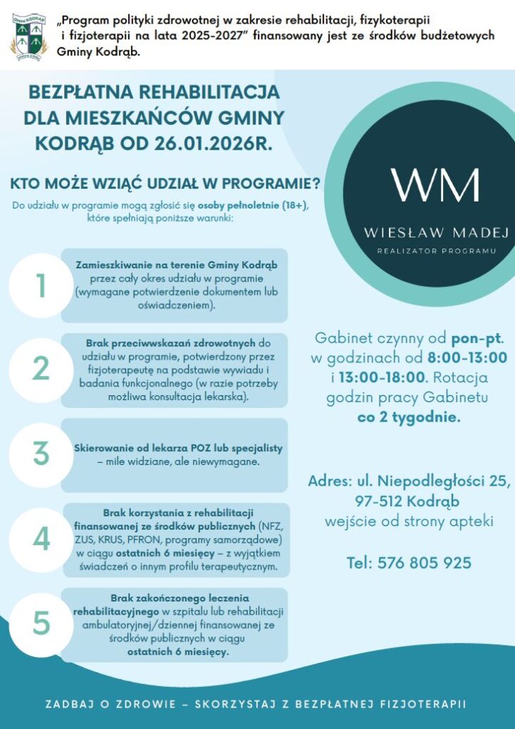 Mieszkańcy gminy Kodrąb będą mogli skorzystać z bezpłatnej rehabilitacji w zakresie fizjoterapii i rehabilitacji ruchowej. Program realizowany będzie w ramach programu polityki zdrowotnej na lata 2025–2027, finansowanego ze środków budżetowych Gminy Kodrąb. Start zaplanowano na 26 stycznia 2026 roku.