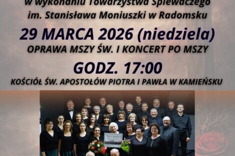 Mieszkańcy gminy Kamieńsk będą mieli okazję wysłuchać Koncertu Pieśni Pasyjnych w wykonaniu Chóru Moniuszkowców z Radomska. Moniuszkowcy zadbają o oprawę mszy o godz. 17 w niedzielę, 29 marca 2026, w kościele pw. św. Apostołów Piotra i Pawła w Kamieńsku. Koncert zaplanowano po nabożeństwie.