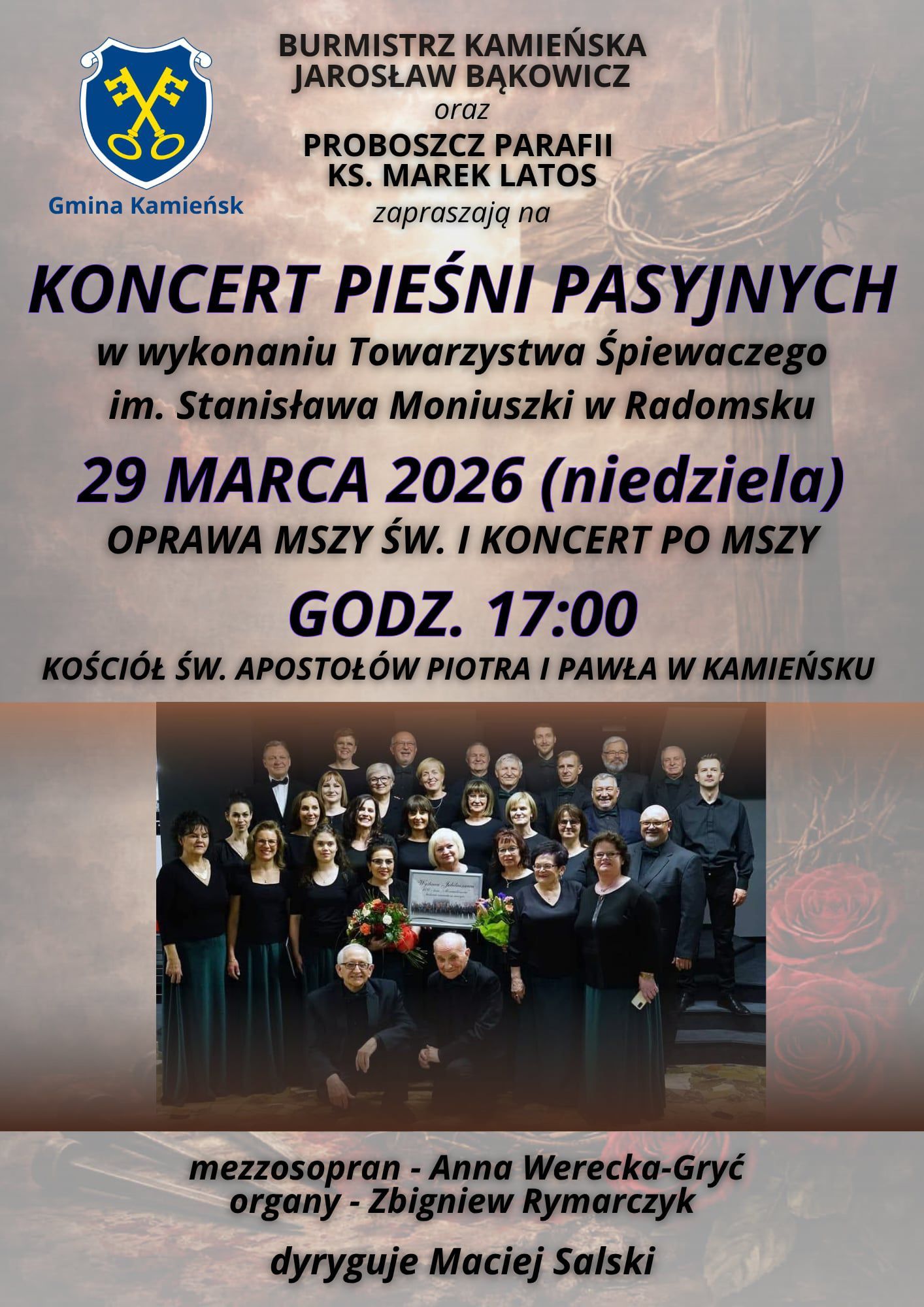 Mieszkańcy gminy Kamieńsk będą mieli okazję wysłuchać Koncertu Pieśni Pasyjnych w wykonaniu Chóru Moniuszkowców z Radomska. Moniuszkowcy zadbają o oprawę mszy o godz. 17 w niedzielę, 29 marca 2026, w kościele pw. św. Apostołów Piotra i Pawła w Kamieńsku. Koncert zaplanowano po nabożeństwie.