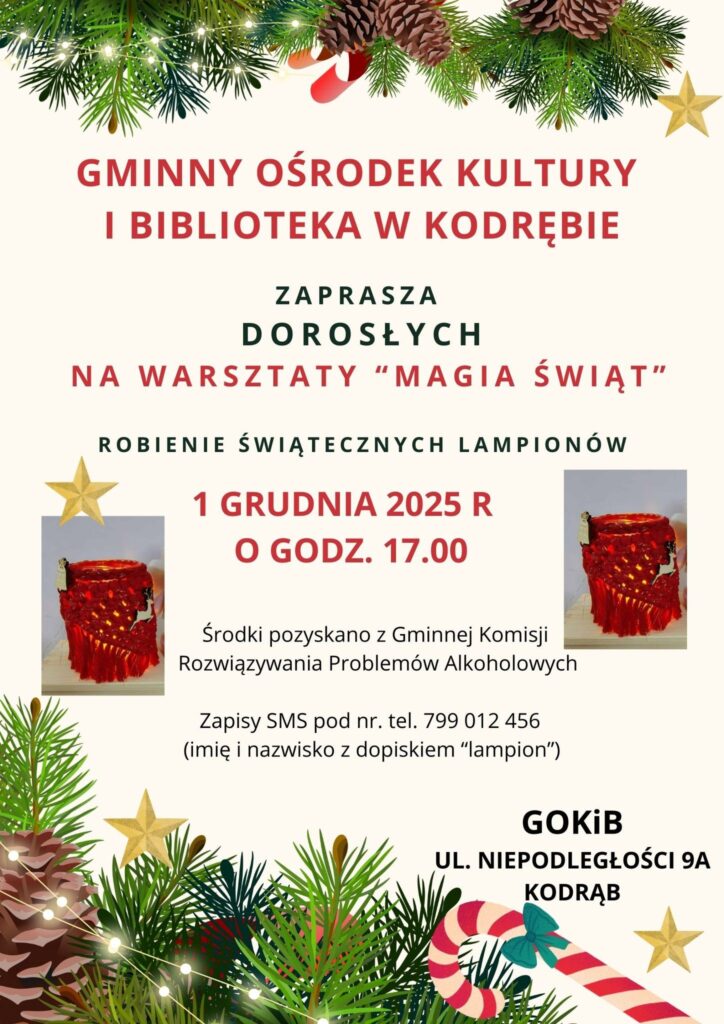 Gminny Ośrodek Kultury i Biblioteka w Kodrębie zaprasza dorosłych na świąteczne warsztaty „Magia Świąt”, podczas których uczestnicy wykonają bożonarodzeniowe lampiony.