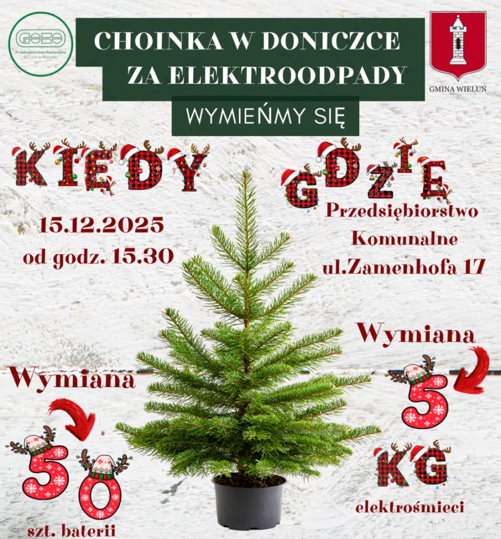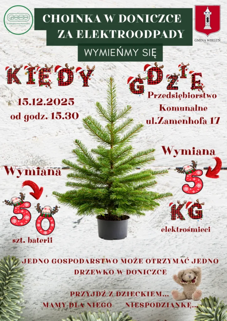 W poniedziałek 15 grudnia o 15:30 Przedsiębiorstwo Komunalne w Wieluniu zaprasza przed swoją siedzibę przy ulicy Zamenhofa 17. Mieszkańcy będą mogli podczas akcji wymienić zużyte baterie lube elektrośmieci na doniczkowe choinki.