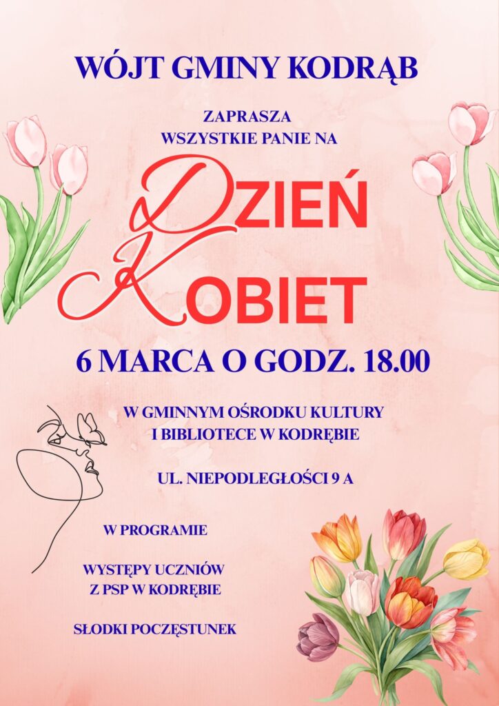 W piątek, 6 marca 2026, wójt gminy Kodrąb Bożena Krawczyk zaprasza na panie na Dzień Kobiet.