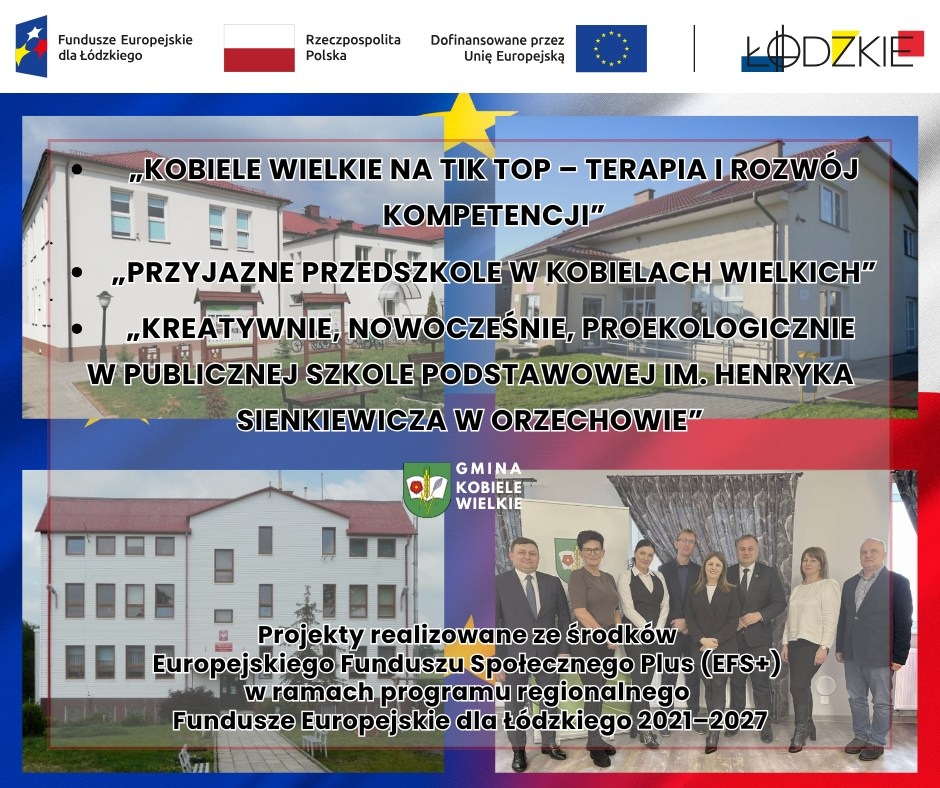 Placówki oświatowe z gminy Kobiele Wielkie realizują trzy projekty, które są finansowane ze środków Europejskiego Funduszu Społecznego Plus (EFS+) w ramach programu regionalnego Fundusze Europejskie dla Łódzkiego 2021–2027.