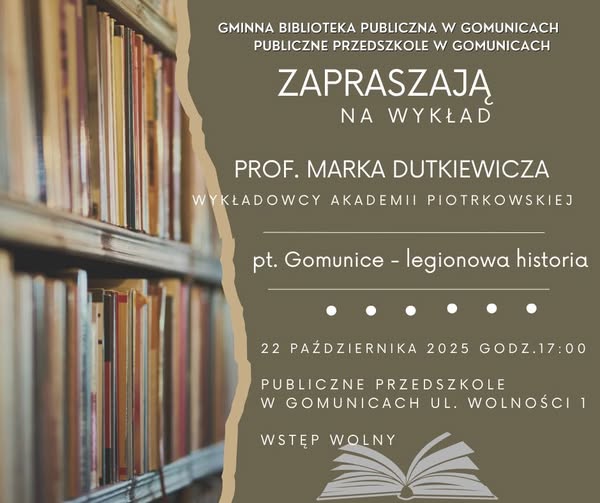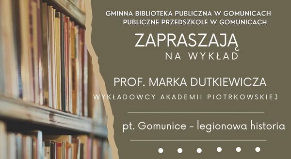 Wszystkich zainteresowanych historią Gomunic oraz wojskowości Gminna Biblioteka Publiczna zaprasza 22 października (środa) o godz. 17:00 na spotkanie z prof. Markiem Dutkiewiczem, wykładowcą Akademii Piotrkowskiej. Tym razem w niecodziennej scenerii Publicznego Przedszkola w Gomunicach.