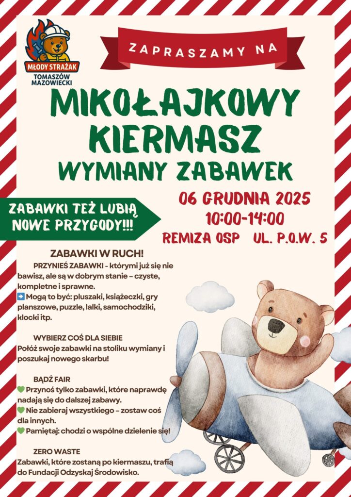 Dziecięca i Młodzieżowa Drużyna Pożarnicza działająca przy Ochotniczej Straży Pożarnej w Tomaszowie Mazowieckim serdecznie zaprasza na Mikołajkowy Kiermasz Wymiany Zabawek. Wydarzenie odbędzie się 6 grudnia br. w godzinach 10:00–14:00; w remizie OSP przy ul. P.O.W. 5. To inicjatywa, która promuje ideę zero waste. Zachęca zatem do odpowiedzialnego podejścia do przedmiotów oraz stanowi doskonałą okazję, by nadać zabawkom drugie życie.