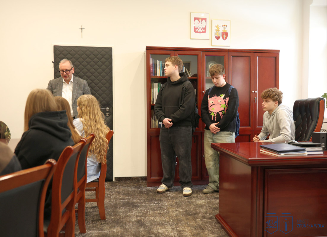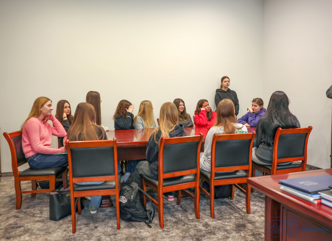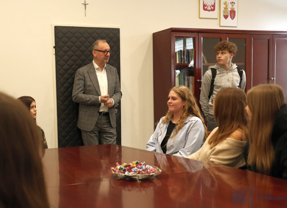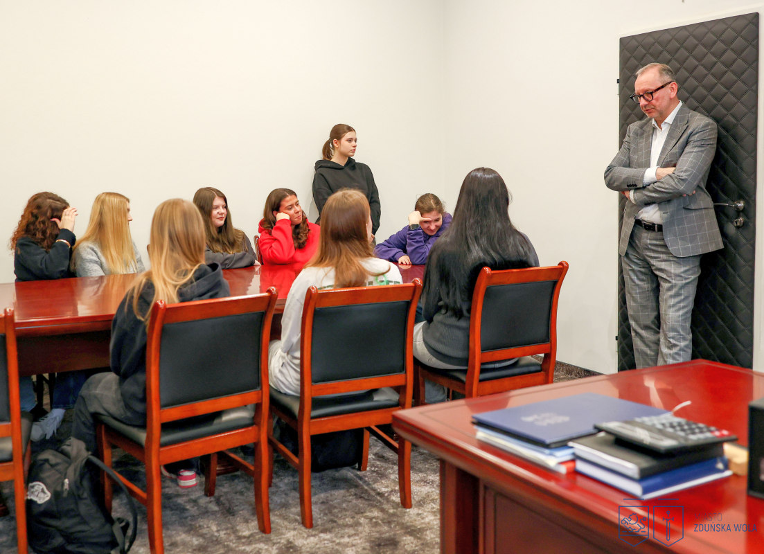 Młodzież z klas drugich o profilu humanistycznym i medycznym odwiedziła gabinet prezydenta Zduńskiej Woli Konrada Pokory. Podczas spotkania rozmawiano o zadaniach samorządu gminnego, kompetencjach prezydenta miasta oraz o tym, jakie sprawy mieszkańcy mogą załatwiać w urzędzie. Uczniowie dowiedzieli się również, jakie obowiązki spoczywają na władzach miasta i czego zduńskowolanie mogą oczekiwać od lokalnego samorządu.