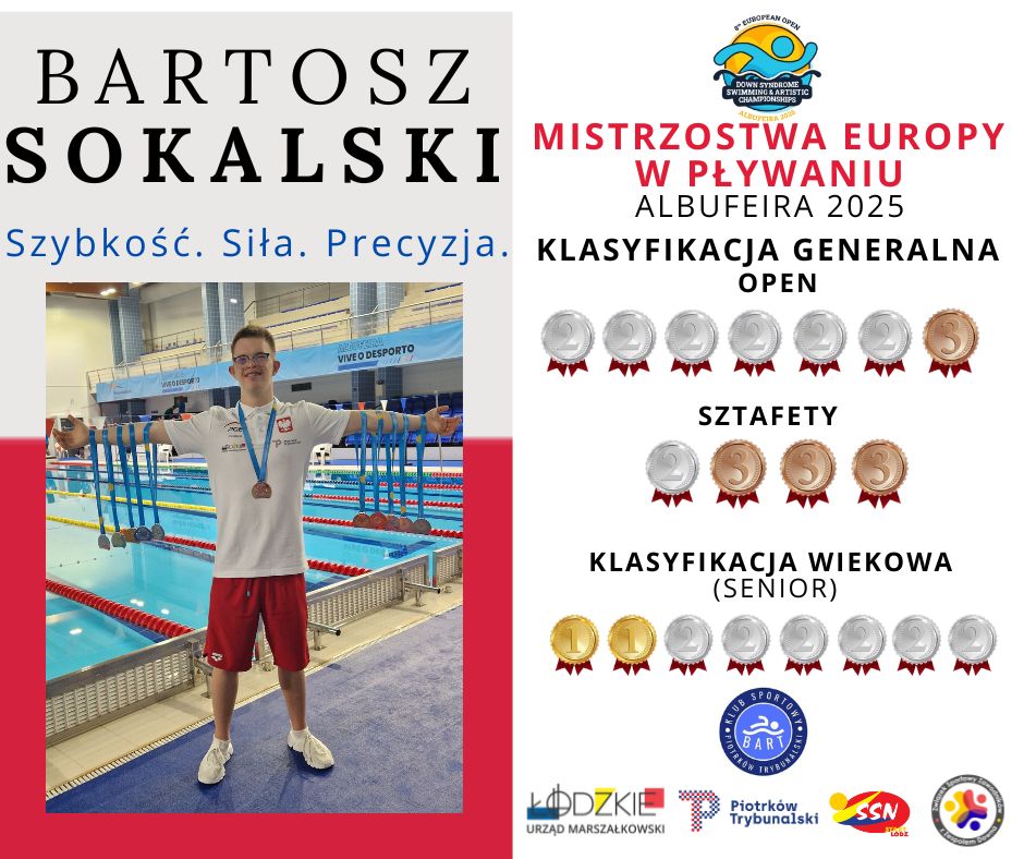 Reprezentacja Polski zajęła trzecie miejsce w klasyfikacji medalowej Mistrzostw Europy. Jagoda Litner oraz Bartosz Sokalski wywalczyli tam komplet medali! European Down Syndrome Swimming Championships 2025 – to zawody, które odbyły się w Portugalii. Reprezentant Polski i piotrkowianin stanął na podium we wszystkich swoich startach, osiągając bardzo dobre wyniki zarówno w konkurencjach indywidualnych, jak i sztafetowych.