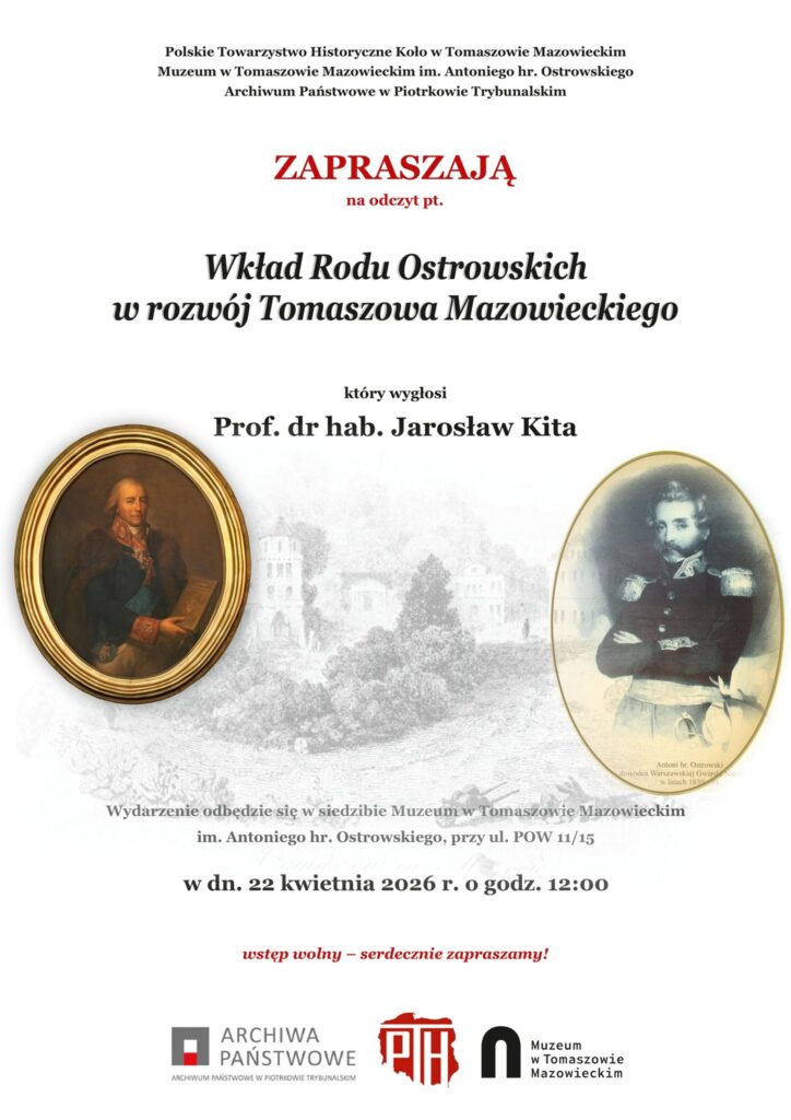 Muzeum im. A. hr. Ostrowskiego w Tomaszowie Mazowieckim zaprasza na wykład prof. Jarosława Kity pt. „Wkład Rodu Ostrowskich w rozwój Tomaszowa Mazowieckiego”.