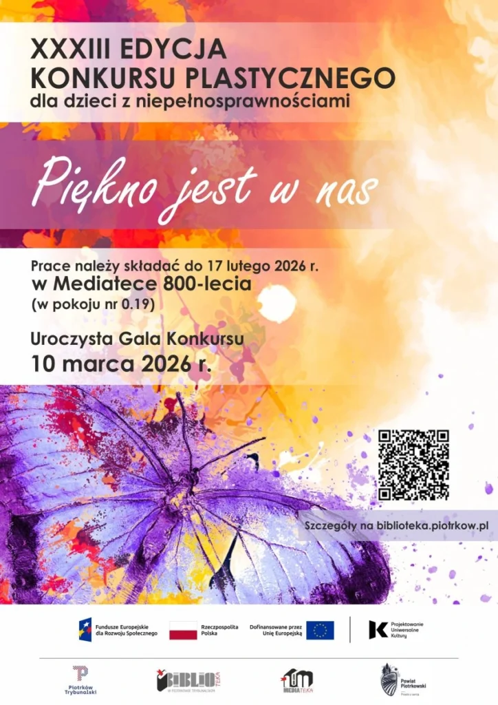 Miejska Biblioteka Publiczna w Piotrkowie Trybunalskim zaprasza dzieci z niepełnosprawnościami z terenu miasta Piotrkowa Trybunalskiego oraz powiatu piotrkowskiego do udziału w XXXIII edycji Powiatowego Konkursu Plastycznego pod hasłem „Piękno jest w nas”.