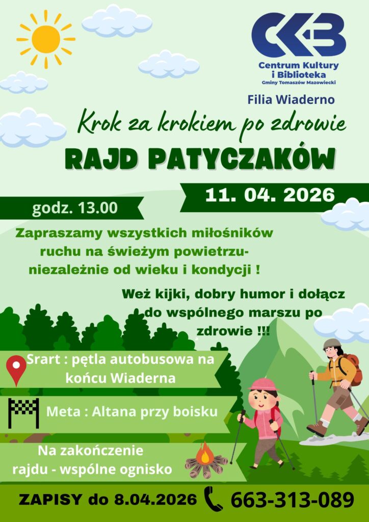 Centrum Kultury i Biblioteka Gminy Tomaszów Mazowiecki – Filia w Wiadernie zaprasza wszystkich miłośników aktywnego spędzania czasu na świeżym powietrzu na wyjątkowe wydarzenie – Rajd Patyczaków.