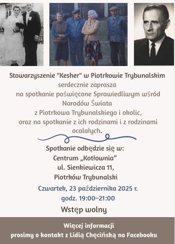 Stowarzyszenie „Kesher” w Piotrkowie Trybunalskim zaprasza na wyjątkowe spotkanie poświęcone Sprawiedliwym wśród Narodów Świata z Piotrkowa Trybunalskiego i okolic. Wydarzenie będzie także okazją do rozmów z rodzinami osób odznaczonych tym tytułem oraz z rodzinami ocalonych.