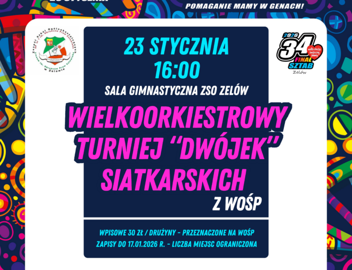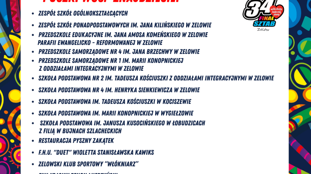 Finałem wszystkich działań będzie 34. Finał Wielkiej Orkiestry Świątecznej Pomocy, który odbędzie się 25 stycznia w Zespole Szkół Ogólnokształcących w Zelowie. Organizatorzy zapowiadają pełne energii, muzyczne wydarzenie – jego dokładny program zostanie ogłoszony w najbliższym czasie.