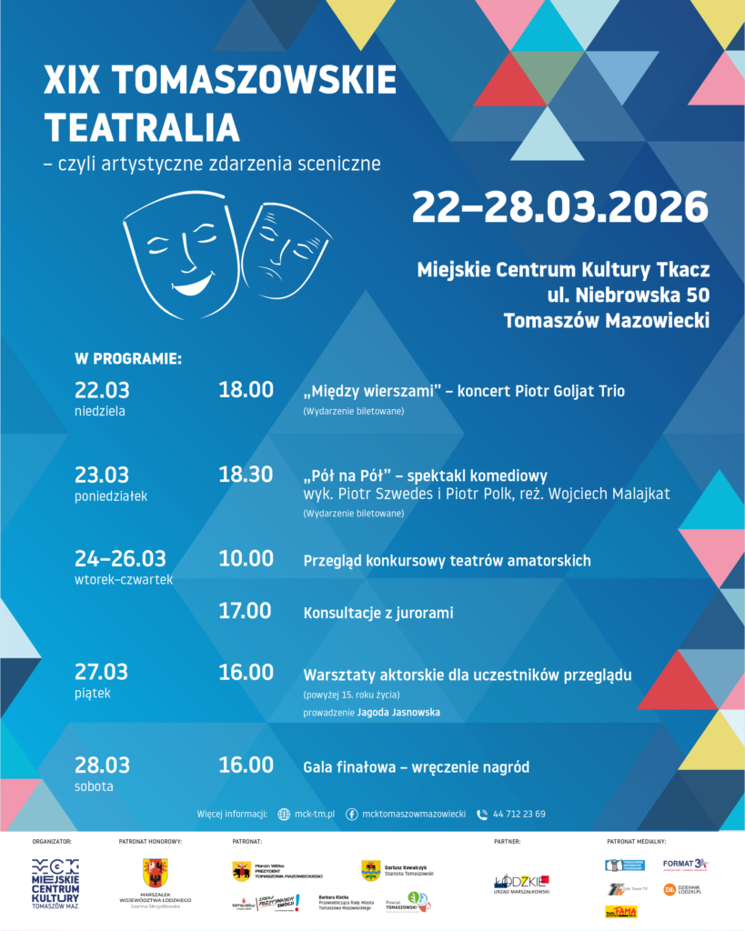 Zbliża się XIX edycja Tomaszowskich Teatraliów. Wydarzenie odbędzie się w dniach 22-28 marca 2026 roku w Miejskim Centrum Kultury Tkacz w Tomaszowie Mazowieckim.