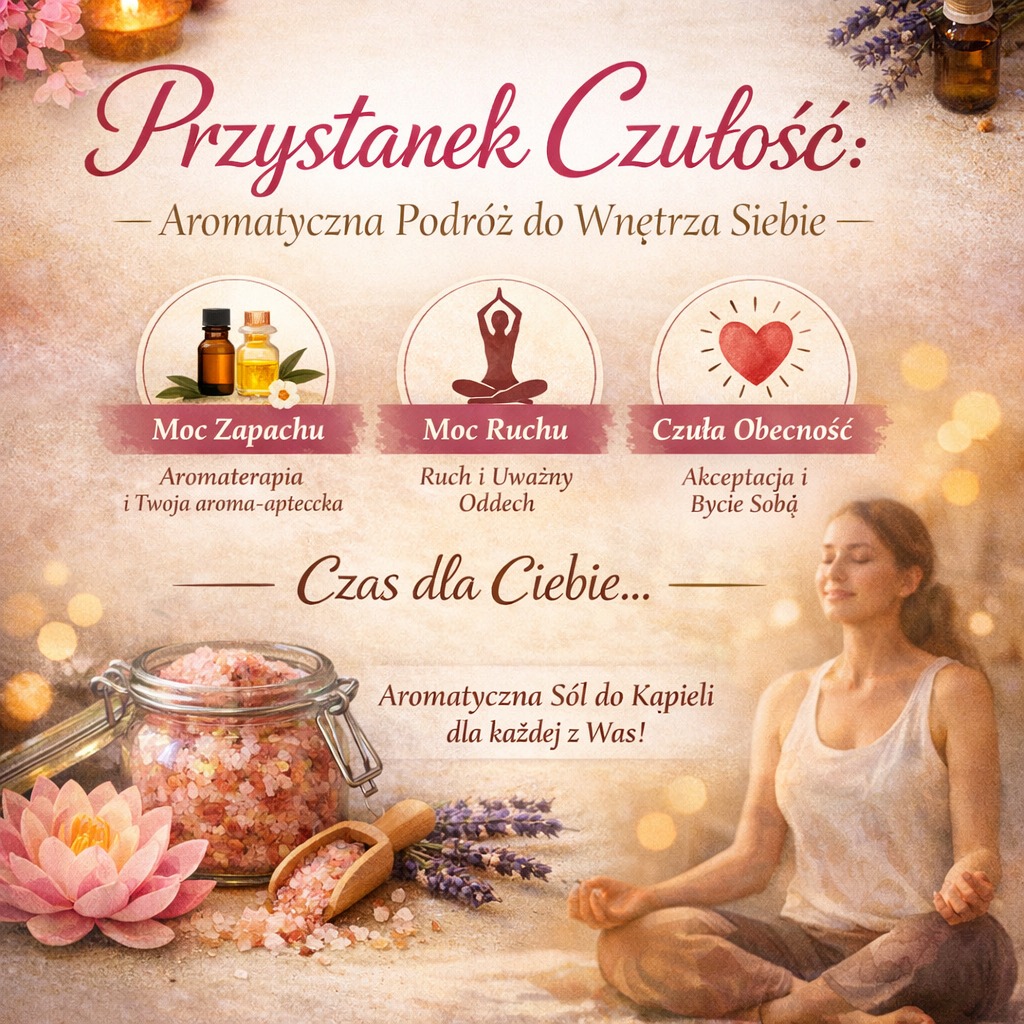 – Z okazji 8 marca zapraszam wszystkie Panie do przestrzeni, w której czas płynie wolniej. To nie będzie zwykłe szkolenie – to 2 godzinny rytuał uważności, podczas którego Wasze ciało i emocje staną się najważniejszymi gośćmi. Wspólnie połączymy doświadczenia trzech zmysłów: węchu, ruchu i słuchu, aby odnaleźć drogę do wewnętrznego spokoju – zapraszają pracownicy GBP w Gomunicach.
