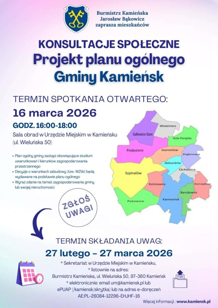 – To ważny moment dla naszej gminy. Wyraź swoje zdanie i zgłoś uwagi! Termin składania uwag mija 27 marca 2026 r. Zachęcam do aktywnego udziału! Wspólnie zdecydujmy o kierunkach rozwoju gminy Kamieńsk – zachęca Jarosław Bąkowicz, burmistrz Kamieńska.